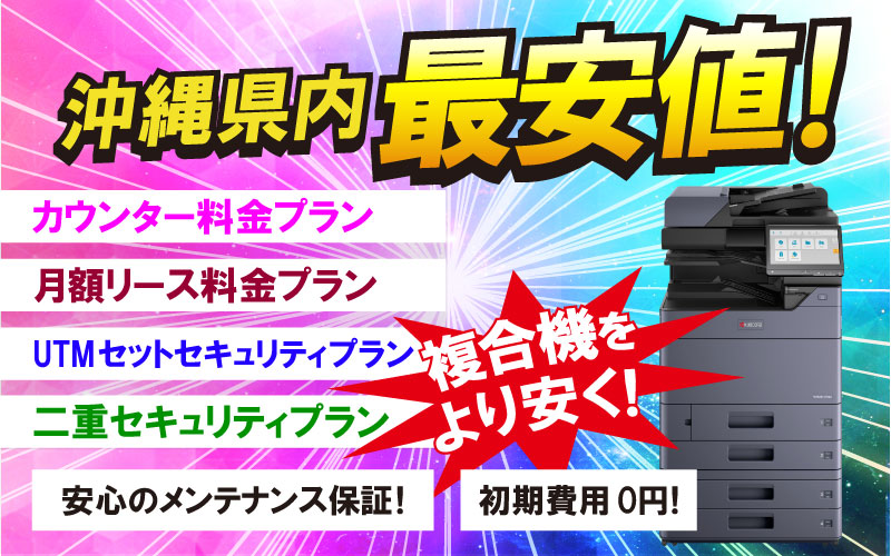 複合機(コピー機) 沖縄県内最安値!弊社の複合機で経費削減!SPEED LINEでは複合機(コピー機)を多様なプランで販売・リースを行なっております。 カウンター料金プラン(モノクロ0.6円/枚〜・カラー6円/枚〜) 月額リース料金プラン(6年リース月額2,800円(税込)A4カラー複合機) UTMセットセキュリティプラン(統合脅威管理!特別価格でご提供) 二重セキュリティプラン(UTM・NASのダブルセキュリティ!)